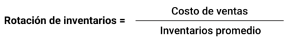 Mide la rapidez con la que se venden los inventarios. Fórmula: Fórmula de rotación de inventarios