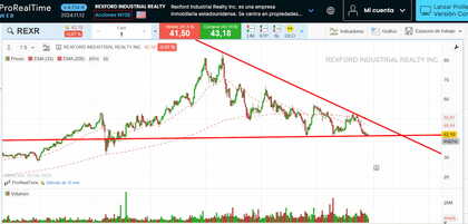 Desde el análisis técnico, la acción podría haber tocado una formación chartista de triple suelo, lo que indicaría una posible recuperación. Según diversos analistas, si REXR vuelve a alcanzar sus niveles históricos de valoración, el potencial alcista podría superar el 75% en los próximos años. Por supuesto, esto dependerá de cómo evolucionen las tasas de interés y la economía global, pero su posición sólida podría beneficiar a los inversionistas con una visión a largo plazo. Gráfico y cotización de REIT Rexford Industrial (REXR)