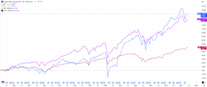 BIZD no busca crecimiento del capital. Su apuesta es por el flujo constante en dólares. Si comparamos su rentabilidad (con dividendos incluidos), queda en buen lugar frente a ETFs como:
