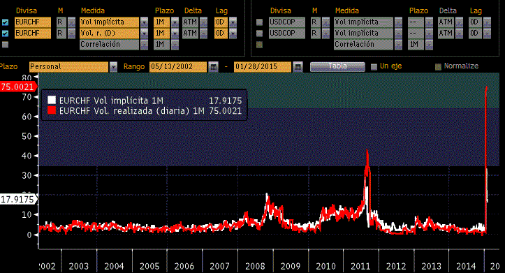 Hace un par de semanas el Banco Central de Suiza (Swiss National Bank - SNB) decidió eliminar el piso que le había puesto a la tasa de cambio EURCHF de 1.20 francos suizos por euro. Esta medida era bastante inesperada por el mercado y en consecuencia el par tuvo un movimiento de aproximadamente el 40% en algunos minutos. Un movimiento de este tipo se considera un salto o en inglés "JUMP". Cuando este tipo de situaciones suceden podemos ver que la volatilidad explota. Por ellos normalmente las opciones muy OTM cotizan con volatilidades implícitas mucho más altas que las volatilidades ATM. A este fenómeno se le conoce como sonrisa de volatilidad o "SMILE". Adjuntamos un artículo que describe con detalle este fenómeno.