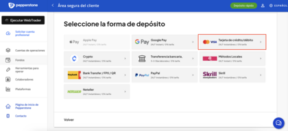Seleccionar "Tarjeta débito/crédito" en Pepperstone