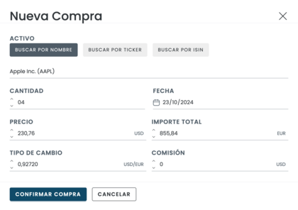 El sistema calculará automáticamente el precio histórico del activo y el tipo de cambio vigente, mostrándote el impacto en tu rentabilidad acumulada.