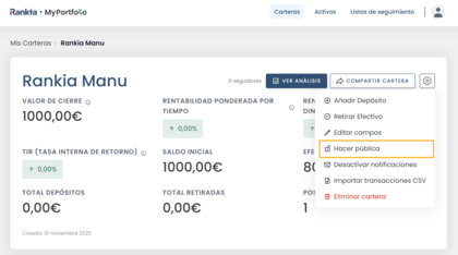 O bien, en la cartera ya creada, haz clic en el icono de configuración → “Hacer pública”. El enlace que se genera puede compartirse: terceros verán la evolución en tiempo real sin modificarla.